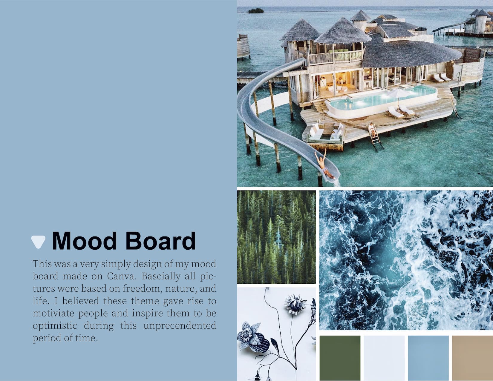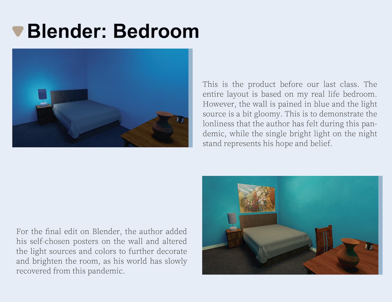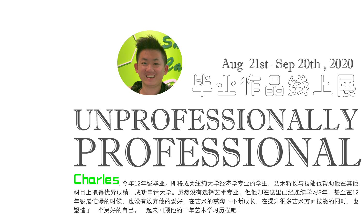 A: I mean art has always been one of my passion since childhood, so through this class, I think I gained a deeper understanding of the actual art, such as what is 2-D drawing or how to create a poster through creative progress. I believe these experiences serve as powerful support in my university years, in which I will be doing my design and drawing.