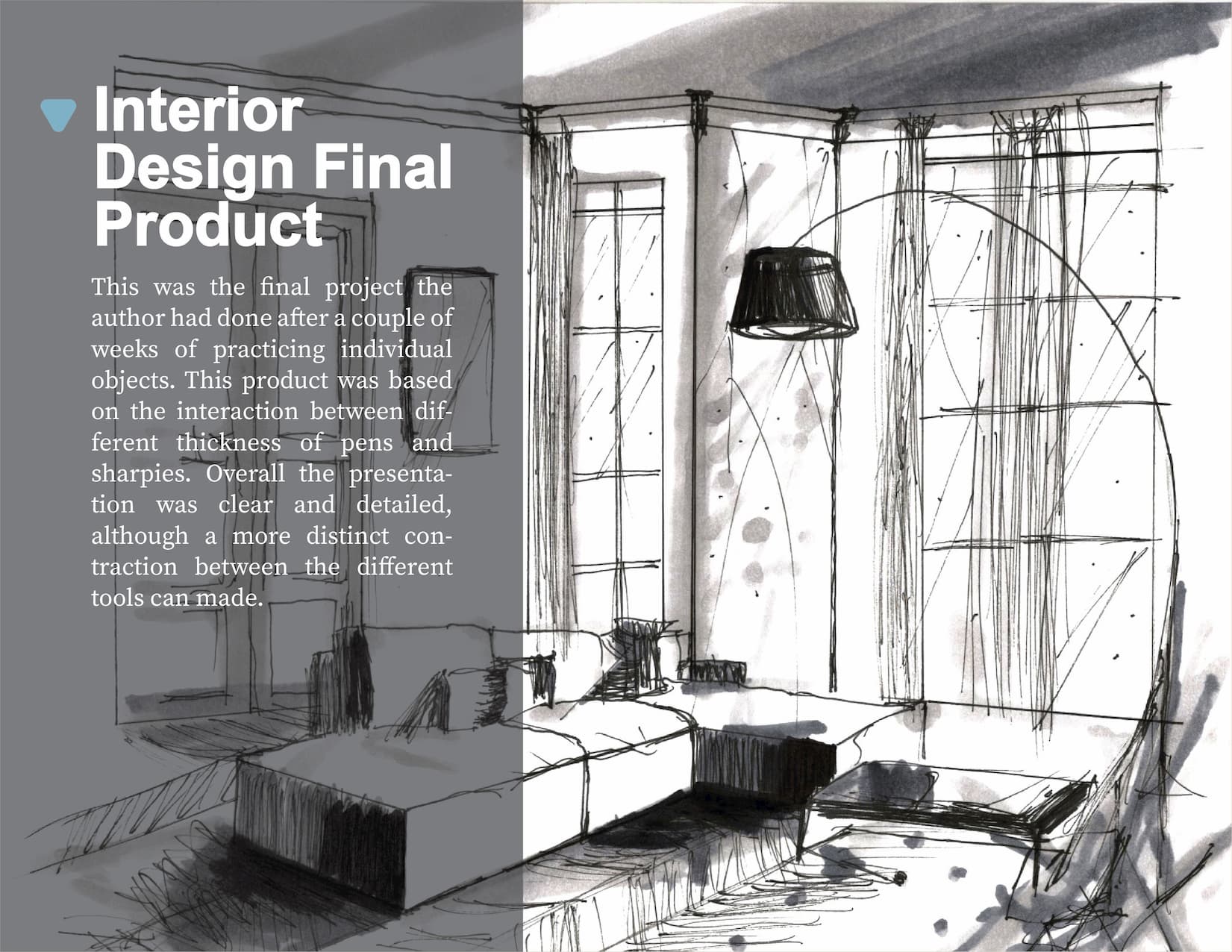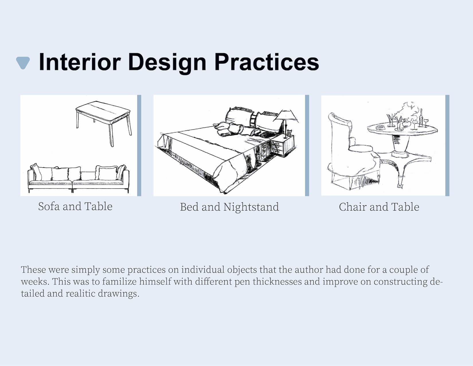 #2, #3: These two drawings are meant to demonstrate our understanding of 2D perspective and the use of fine liners. Both artworks are built upon reference images based on my own feelings and my own imagination. Through these drawings, I have had the opportunity to try out drawing different shapes and lines when using fine liners. The whole experience is nothing but the best.